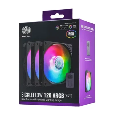 فن کیس کولر مستر مدل SICKLEFLOW 120 ARGB BLACK با طراحی زیبا و مدرن، به کیس شما جلوه‌ای خاص و زیبا می‌بخشد.در فن خنک‌کننده کولرمستر مدل SICKLEFLOW 120 ARGB 3IN1 سه فن 120 میلی‌متری قرار داده است تا کم‌ترین میزان نویز صدا تولید شود و در عین حال فن‌ها با نهایت قدرت به بهترین شکل ممکن کار کنند؛قطعات ضد گرد و غبار فن نیز با پیشرفتی چشم‌گیر مانع از نشت روغن فن به داخل کیس می‌شوند. سرعت چرخش این فن‌ها بین 650 تا 1800 دور در دقیقه قابل تنظیم است.