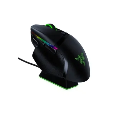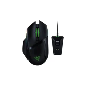 ماوس بی سیم ریزر Razer Basilisk Ultimate به همراه پایه شارژر در کنار دقت بالا، زمان تأخیر و لگ بسیار کوتاهی دارد مناسب برای گیمرهای حرفه‌ای و نیمه حرفه ای. با کمک فناوری HYPERSPEED ریزر، این ماوس 25 درصد سریع‌تر از سایر فناوری‌های بی‌سیم موجود عمل می‌کند. رنگ و نور هر ناحیه در این ماوس بی‌سیم می‌تواند به صورت جداگانه در Chroma Studio برنامه ریزی شود.دارای صفحه‌ای قابل دسترس در قسمت زیرین ماوس است که امکان تغییر مقاومت چرخ اسکرول آن را در اختیارتان می‌گذارد. با استفاده از این سطح شخصی سازی، شما می‌توانید در مواردی مثل انتخاب بین سلاح‌ها و سایر اقداماتی که با چرخ اسکرول انجام می‌شود، راحت‌تر جابه‌جا شوید. جدیدترین سنسور ماوس که دارای بالاترین مشخصات در بازار است و با دقت تفکیک 99.6٪ و امکاناتی مانند ردیابی هوشمند، قطع نامتقارن و همگام سازی حرکت برای بهترین عملکرد، بهینه شده.